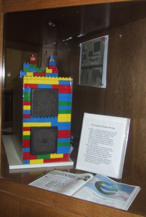 The development of the Google algorithms was carried on on a variety of Computers, mainly provided by the NSF-DARPA-NASA-funded Digital Library project at Stanford. Click to see the equipment in its laboratory setting on the basement floor of Gates Information Sciences. Crawling the web to obtain its link structure required an enormous amount of storage in comparison with typical student projects at that time. We show here the original storage assembly, containing 10 4 Gigabyte disk drives, giving 40 Gbytes total.